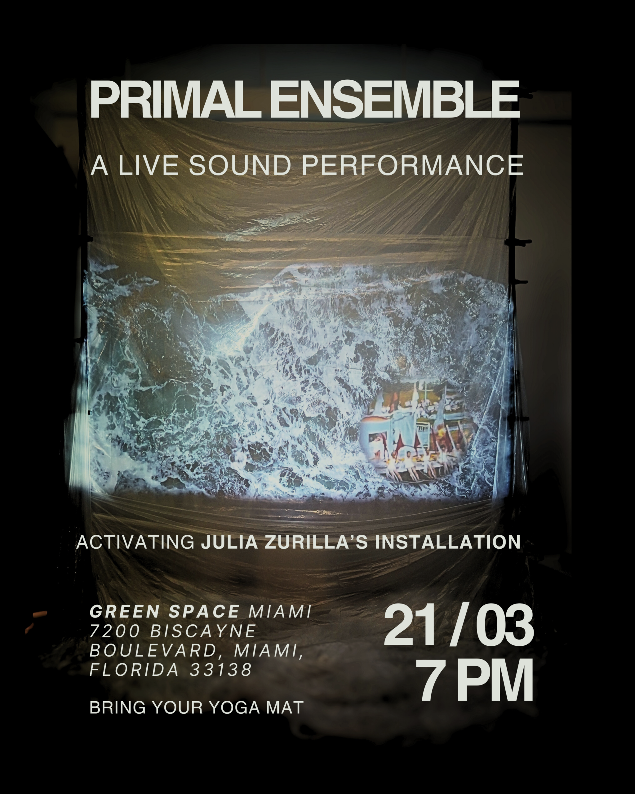 Primal Ensemble presents a live sound activation of Julia Zurilla’s immersive installation Tide of Memory at Green Space Miami. Through improvisation with percussion, synthesizers, and acoustic instruments, the ensemble creates a sonic landscape that evokes meditative resonances, like the sound of the sea or the wind, dialoguing with the projected imagery and the material qualities of the space.